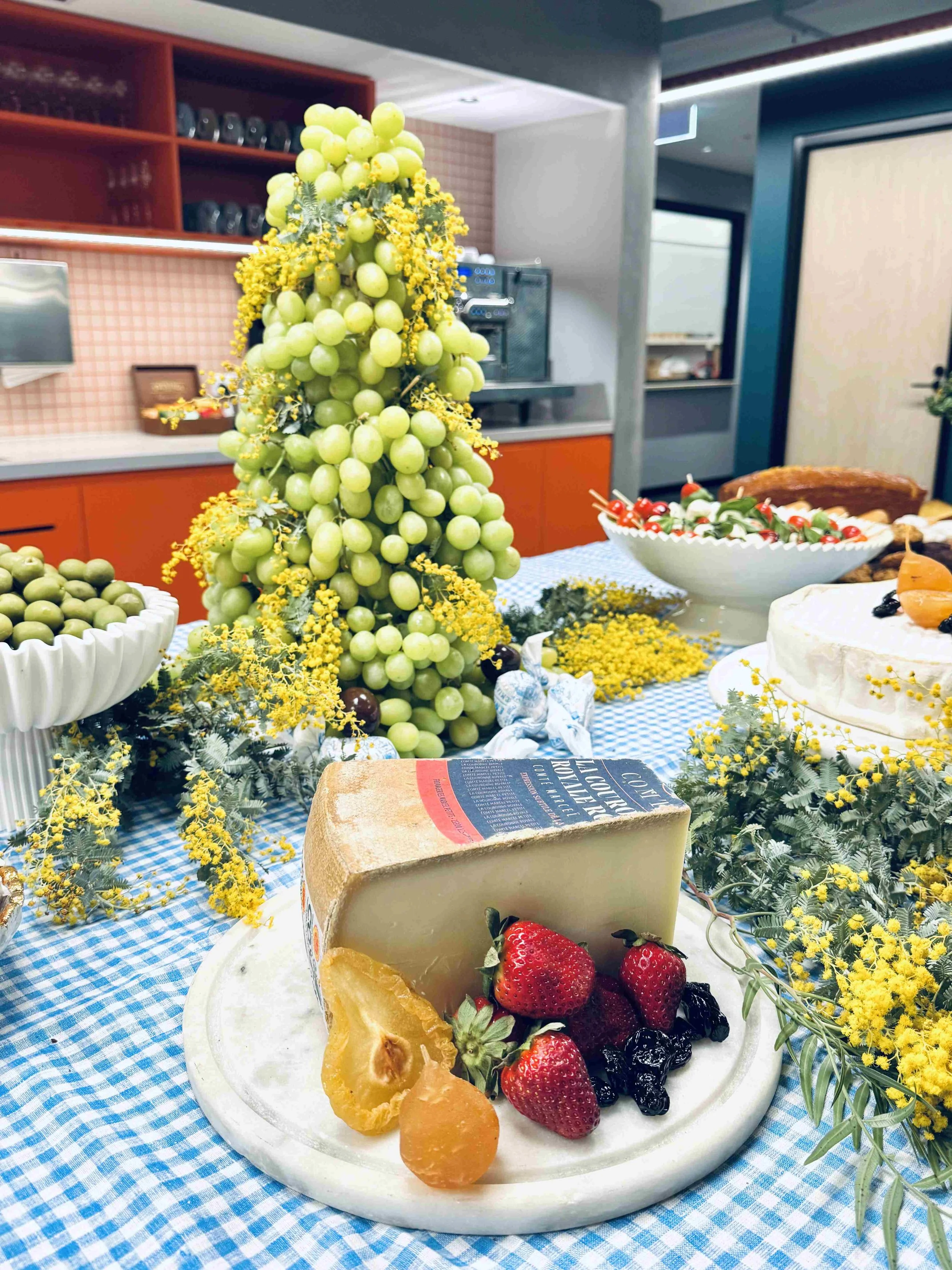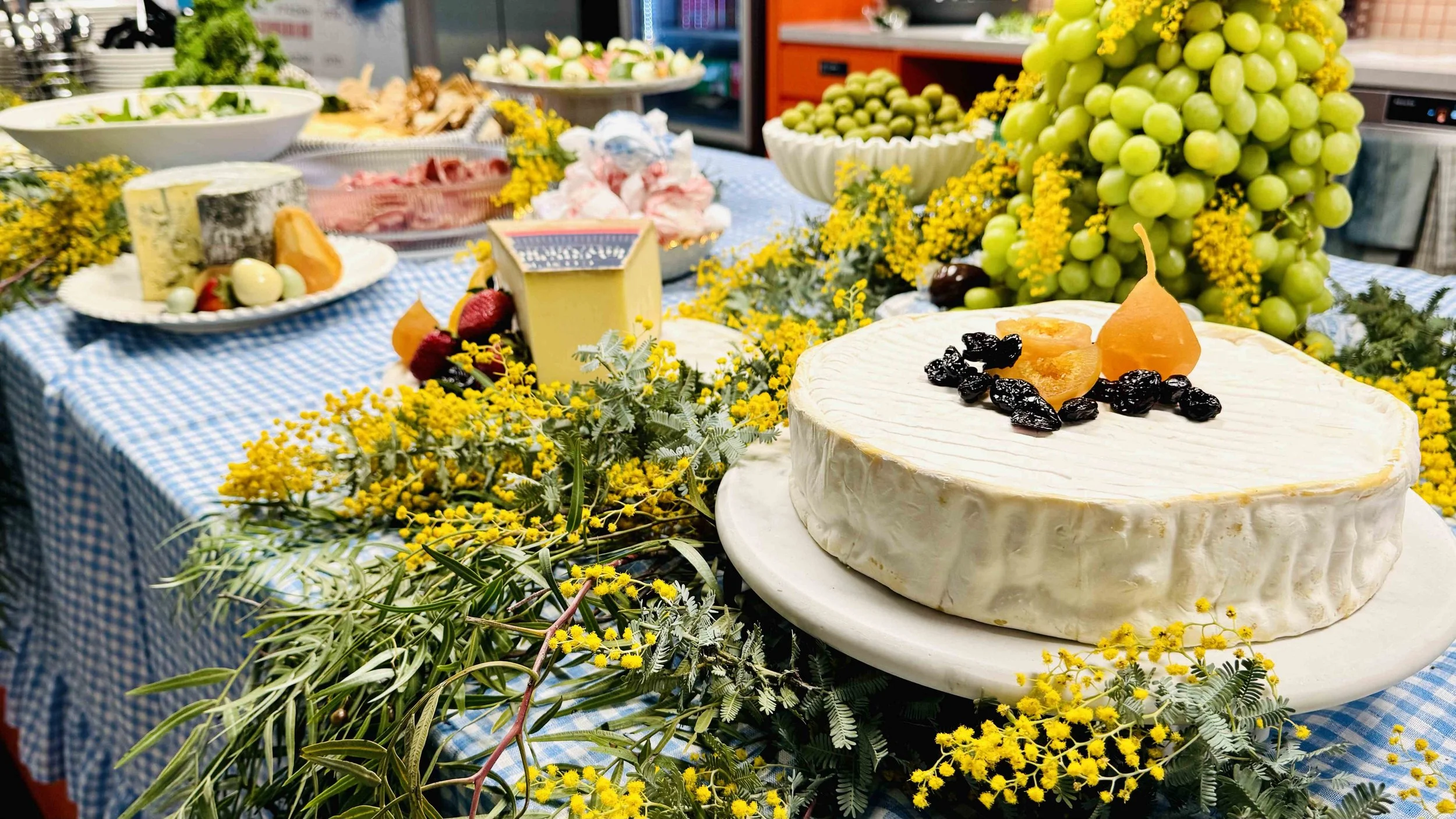 Grazing Table for Hatched Media. Melbourne. August 2023. Wattle in full bloom 3 metre flay lay grazing table.